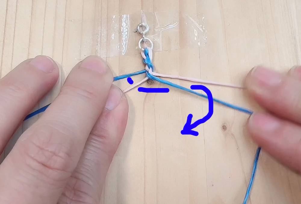 用膠帶將扣頭固定在桌上,先在桌上編織以熟悉這個繩結的編法